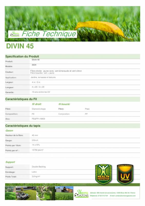 Il a été conçu avec des fibres type diamant de couleur vert émeraude, vert citron et des pointes de jaune ocre afin de faire du divin 45 un des gazons synthétiques les plus réalistes en France.