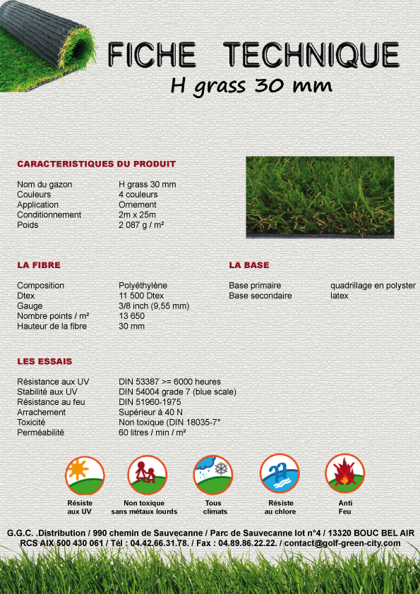 Le H grass 30 mm se présente en rouleau de 2m de large et nous le découpons au prorata de votre surface.