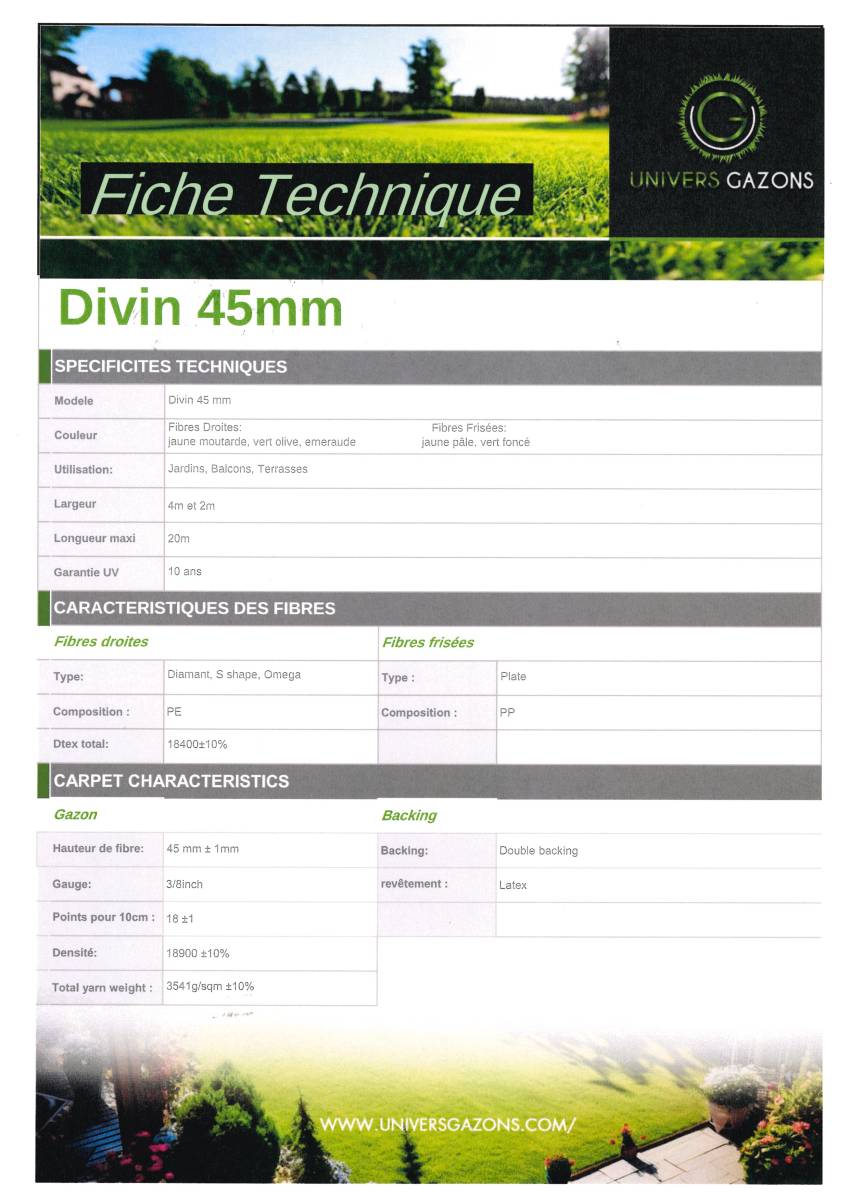 Il a été conçu avec des fibres type diamant, en S et nervurées. De couleur vert émeraude, vert citron et des pointes de jaune ocre afin de faire du divin 45 un des gazons synthétiques les plus réalistes en France.