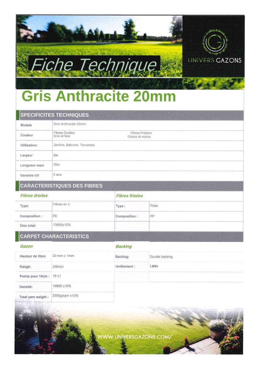 Cette pelouse artificielle de couleur grise anthracite de se compose d'une largeur de 2m et d'une longueur maximum de 25m.