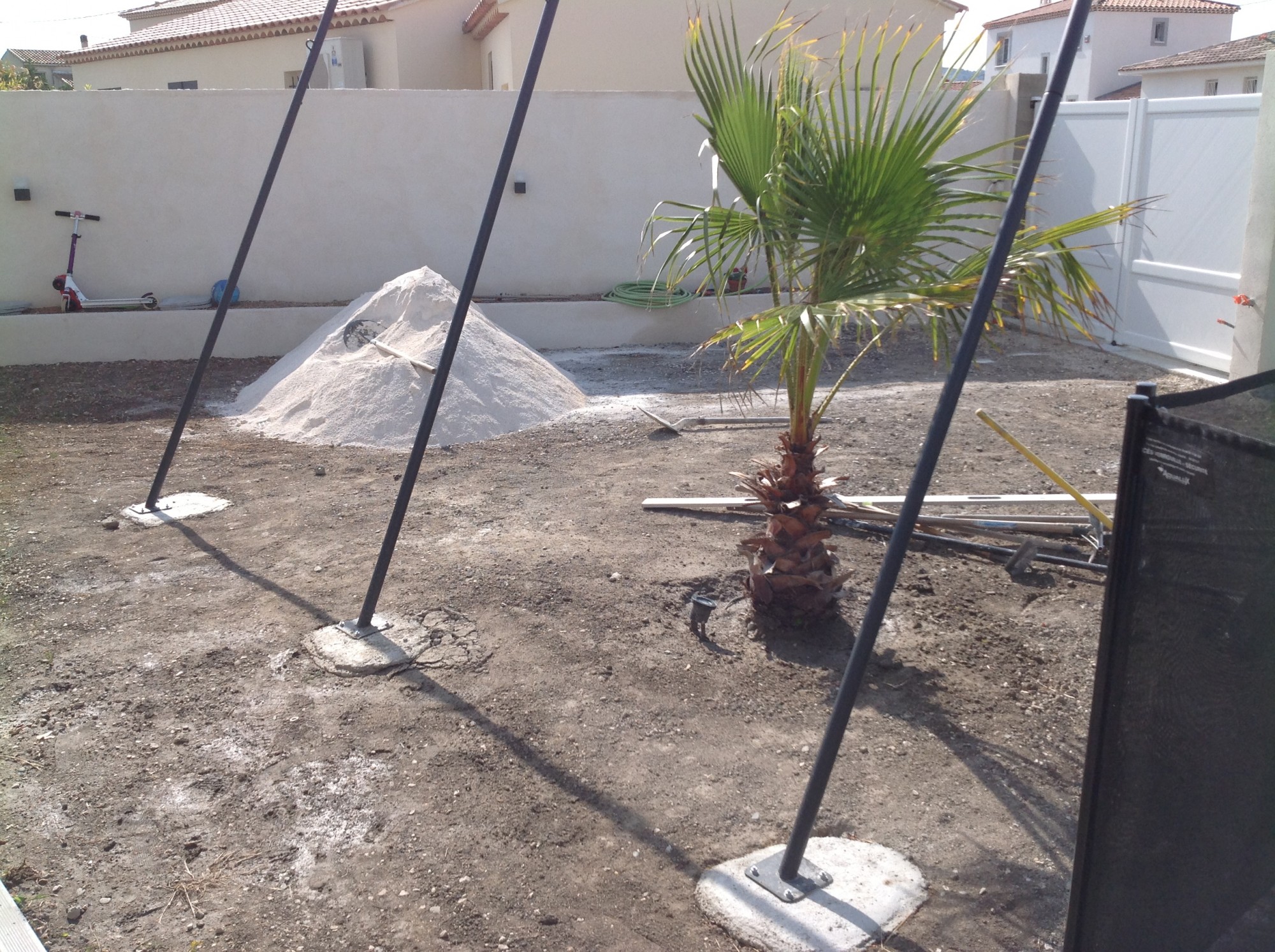 Chaque pose a ses impératifs. Pour ce chantier de pose de pelouse artificielle dans un jardin montpelliérain, nous avons commencé par niveler le terrain avec une mini pelle. Ensuite, nous avons étalé 4 tonnes de sable à bâtir 0.2 sur toute la surface puis compacté le tout au plateau vibrant.