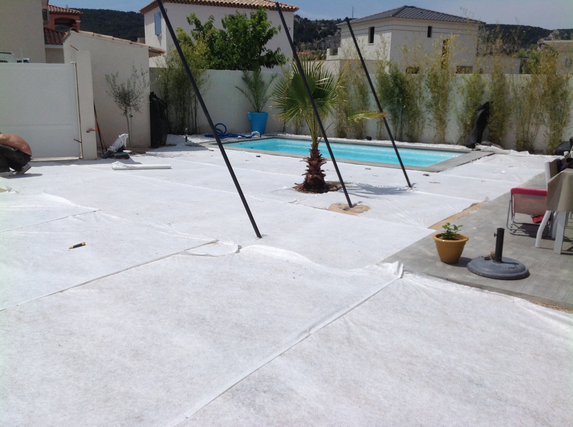 Avant de poser son gazon synthétique, il est important de bien préparer le sol, car, avant toute installation, la surface doit être propre et lisse. Pour éviter la repousse d’herbe, nous avons placé un géotextile que nous avons clouté au niveau des jonctions et sur toute la périphérie tous les 30/40 cm. Il est très important de bien fixer votre géotextile ou votre toile de paillage anti repousse pour éviter les plis. Ensuite, nous avons commencé à placer lés de gazon artificiel toujours dans le même sens.