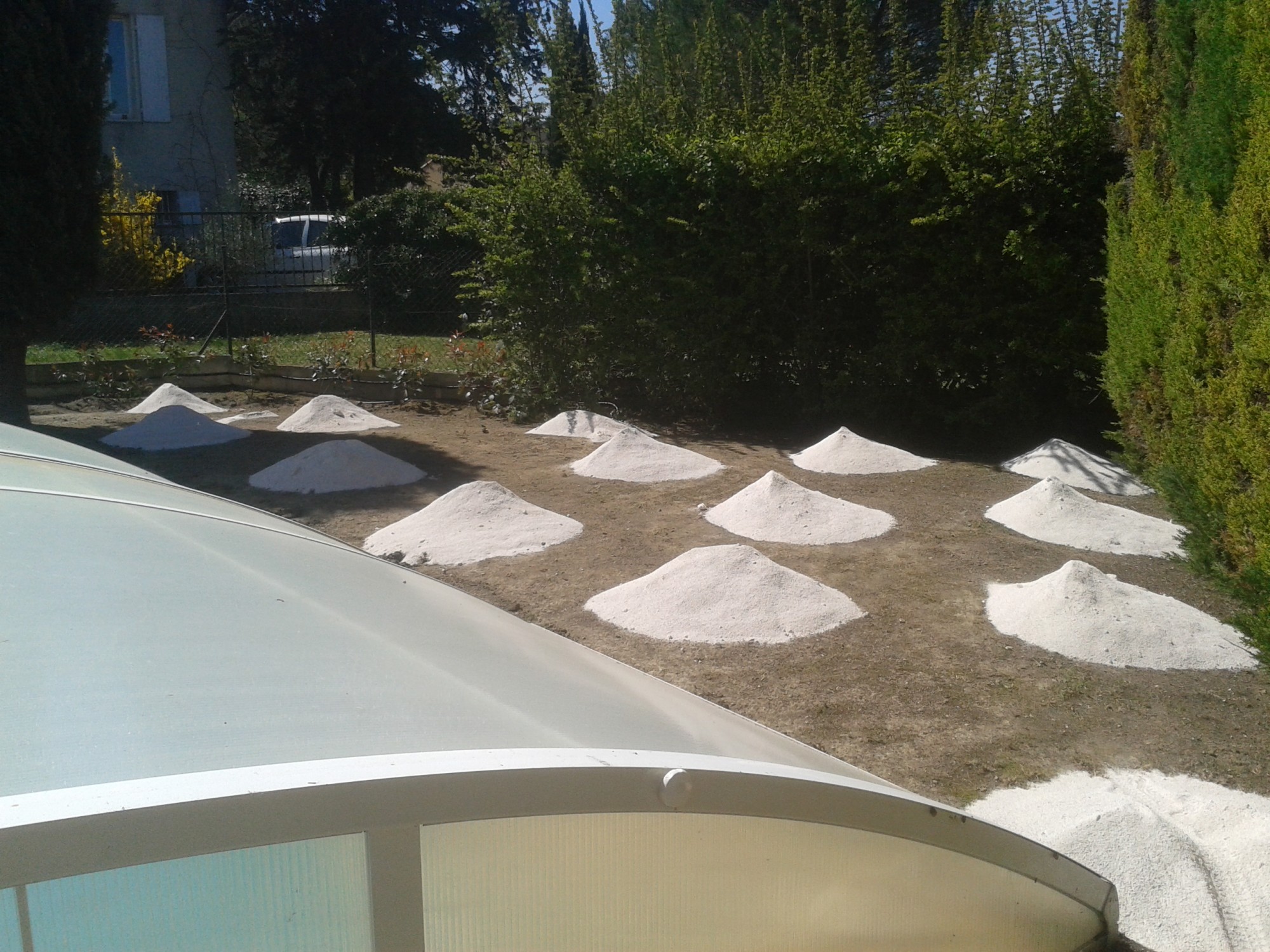 Ensuite, pour enlever les dernières aspérités (les trous et les bosses), nous avons étalé une couche de sable calcaire 0.2 sur une hauteur de 2 à 5 cm.