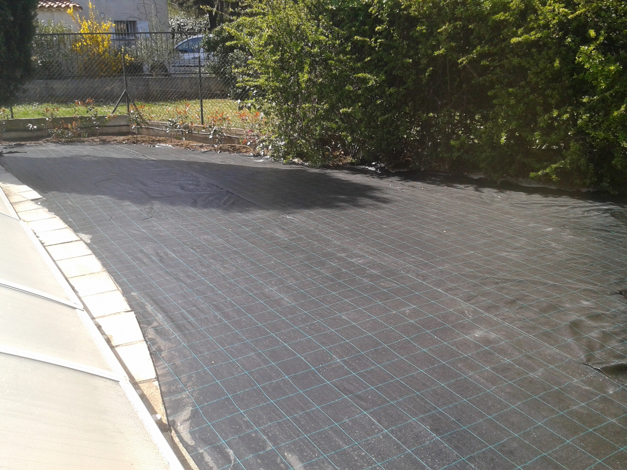 La deuxième étape est la mise en place d’une toile de paillage anti repousse de 120 g.