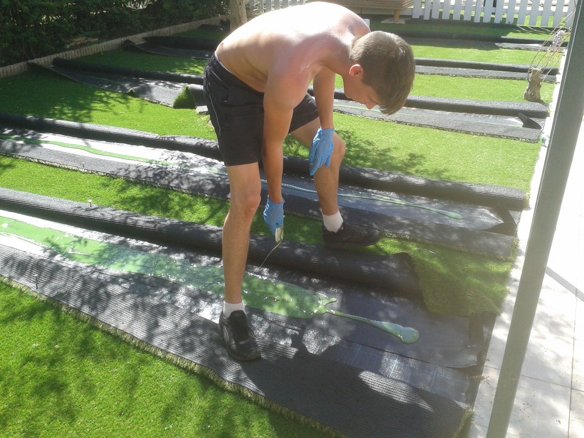 En effet, chaque jonction est collée à l’aide d’une bande de pontage et d’une colle verte bi composante spécifique au gazon synthétique.