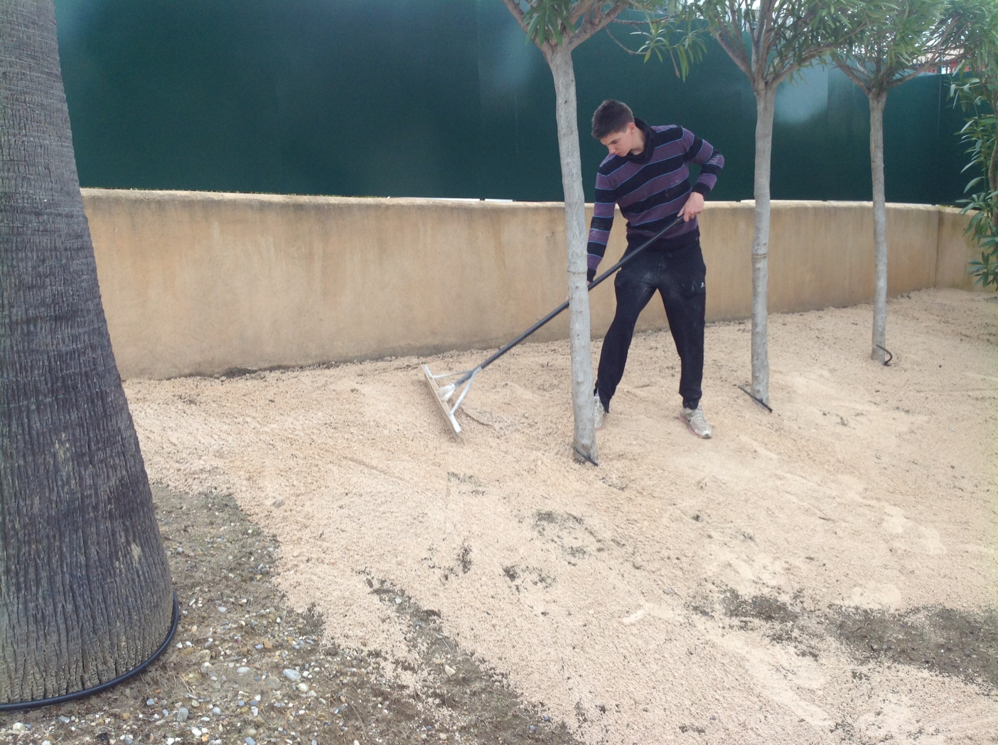 Pour enlever les aspérités nous avons étalé une fine couche de sable stabilisé 0.2 sur 2 à 5 cm à l’aide d’une règle de maçon.