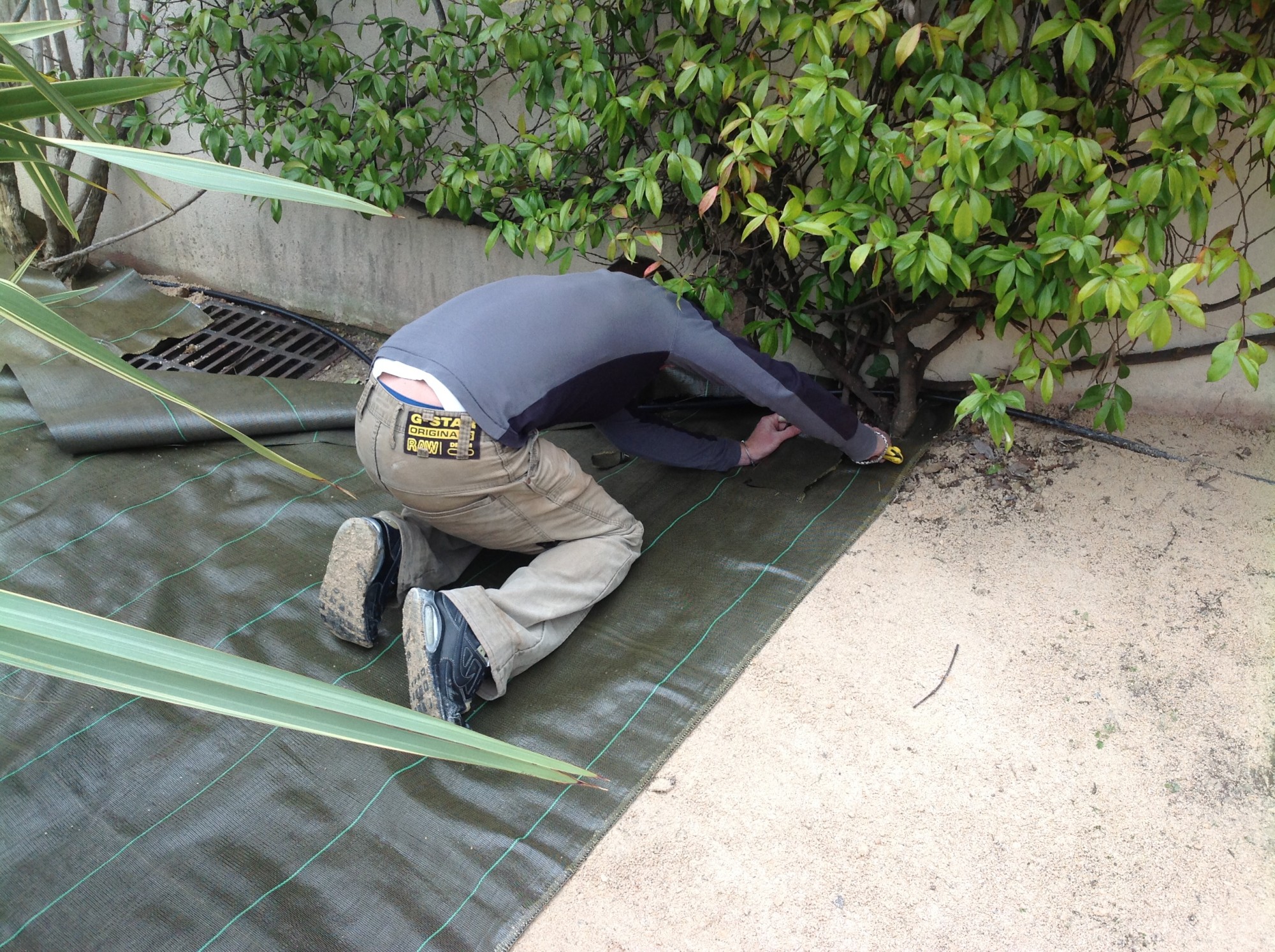 Pour éviter à l’herbe de repousser nous avons posé une toile de paillage anti repousse pour éviter aux mauvaises herbes de repousser