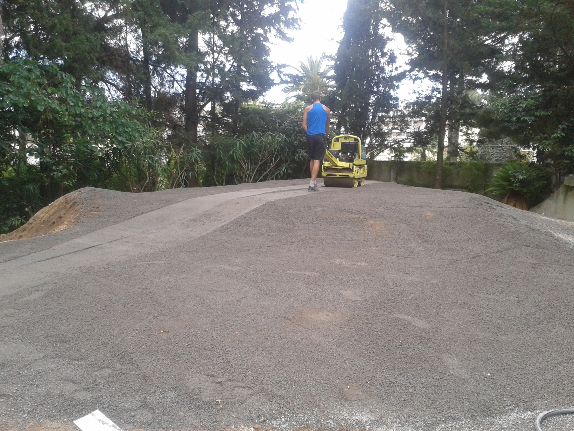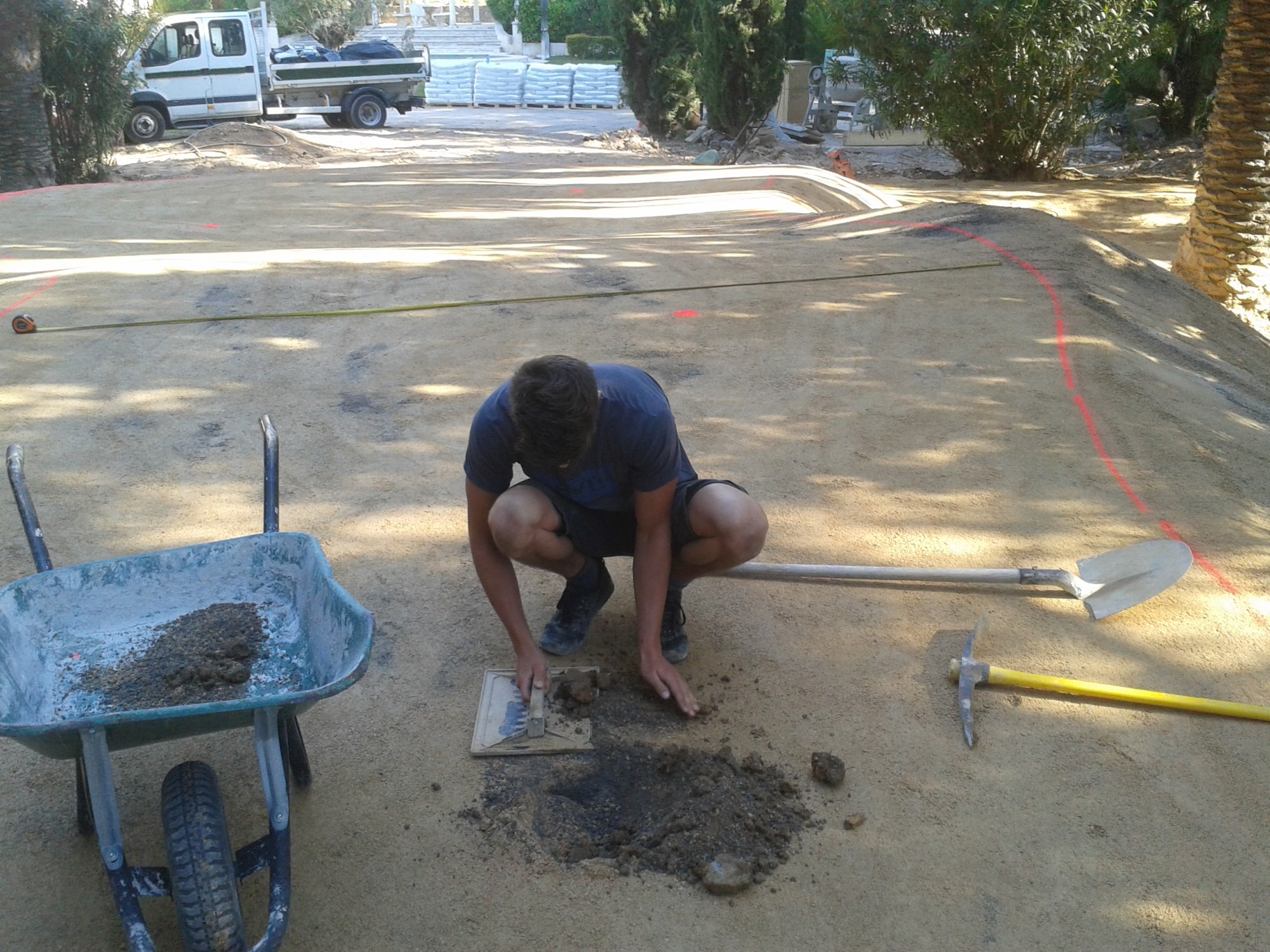 Notre équipe à commencé par éliminer le restant d' herbe existant sur la propriété. Puis est venue la valse des camions d'agrégats afin d'apporter la matière nécessaire aux divers fonds de formes, que ce soit pour le green à double-plateau que pour l'ensemble du jardin.