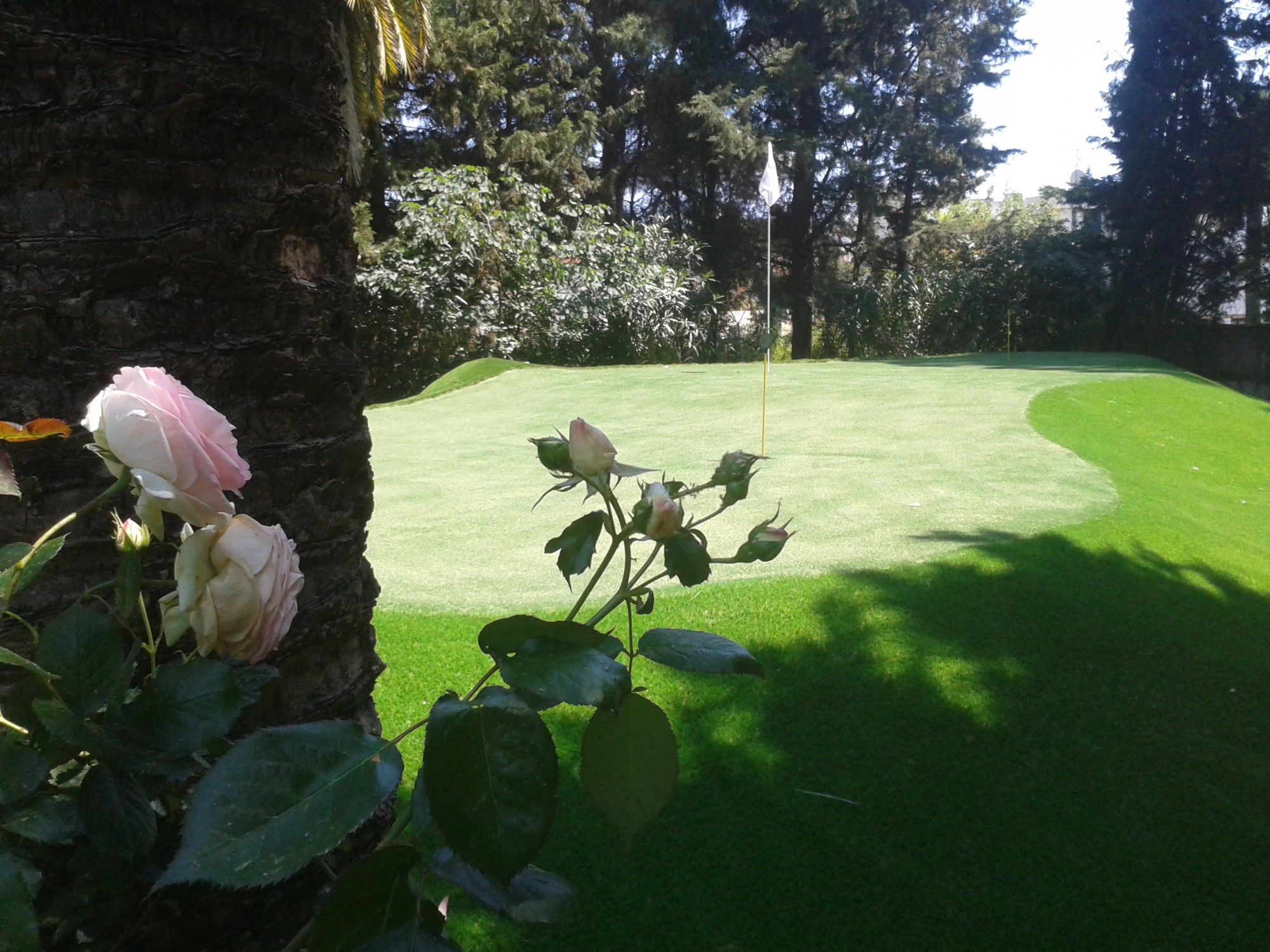 Pas moins de 10 jours ont été nécessaires afin de venir à bout de ce green synthétique de 100m² et entourage de 500m² de gazons synthétiques d'ornement.