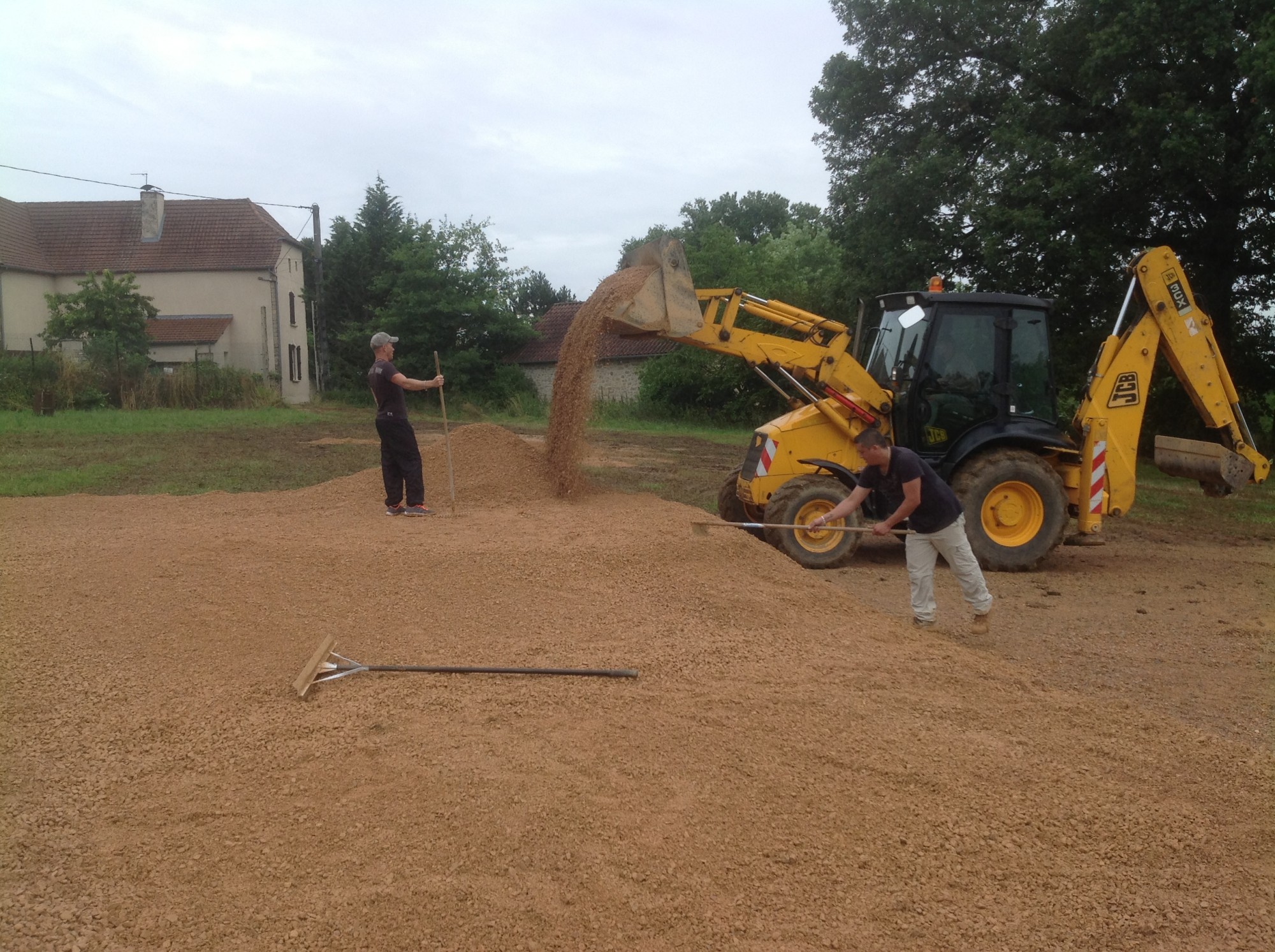 Enfin pour enlever toutes les aspérités du tout-venant nous avons étalé une fine couche de sable calcaire 0.4 sur 2 à 5 cm.