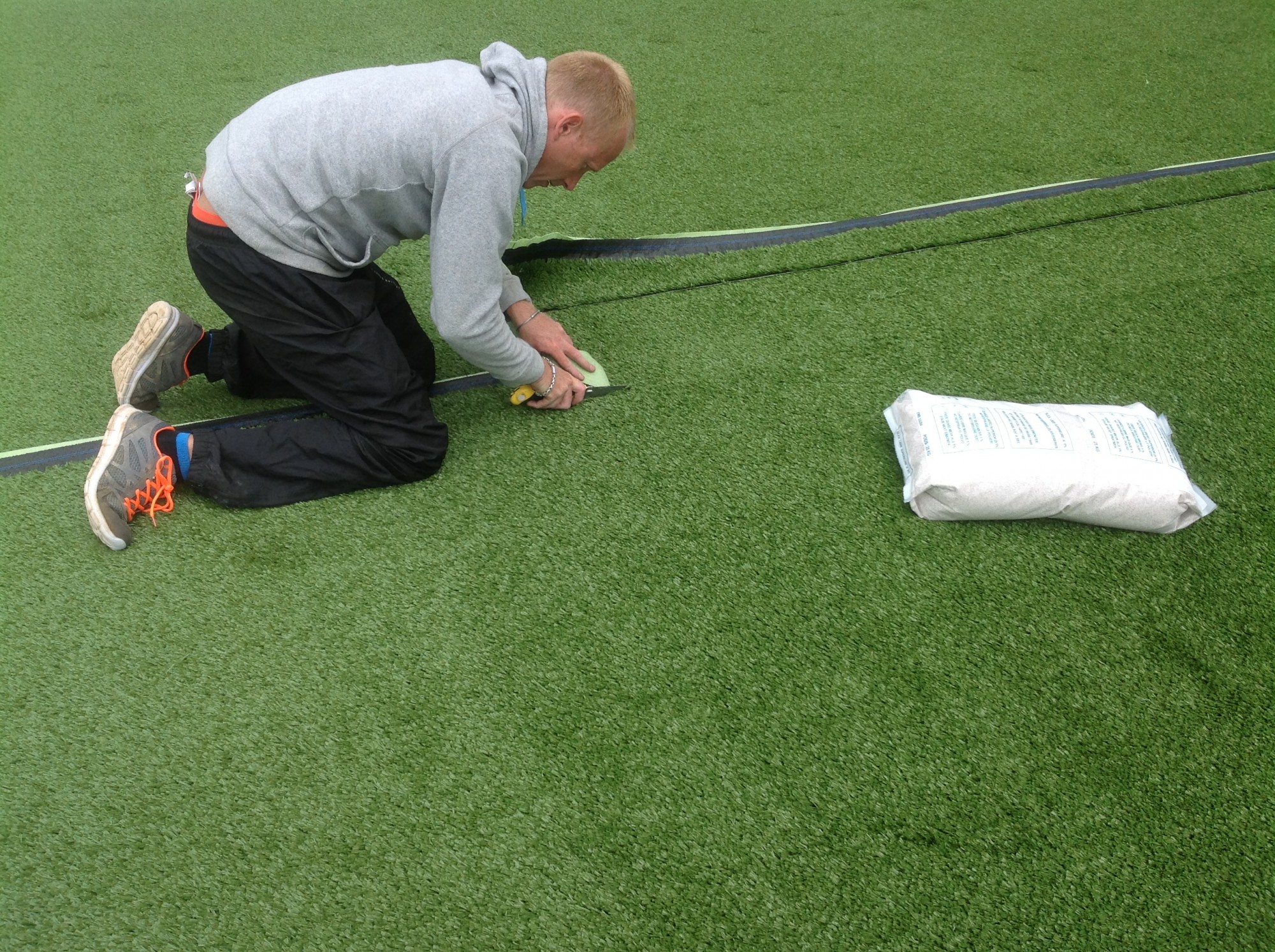 Le gazon est par la suite sablé à hauteur de 30 kg de silice naturelle et de 10 kg de silice bi color (vert et jaune) avec enrobage en polyuréthane.