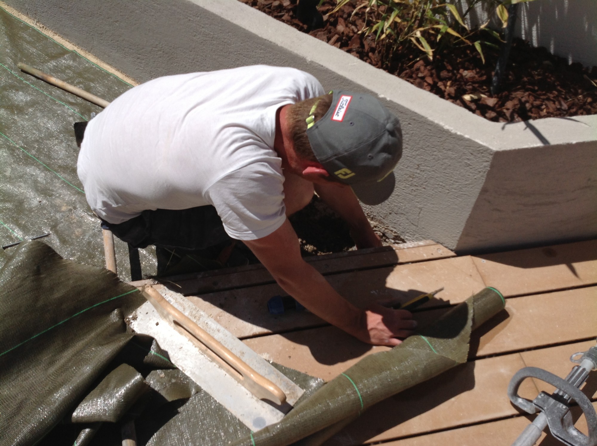 Pour éviter que l’herbe ne repousse, nous avons placé notre toile de paillage. Les lés de toile de paillage de 2m de large sont cloutés au niveau des jonctions et sur toute la périphérie à l’aide de nos clous de charpentier.