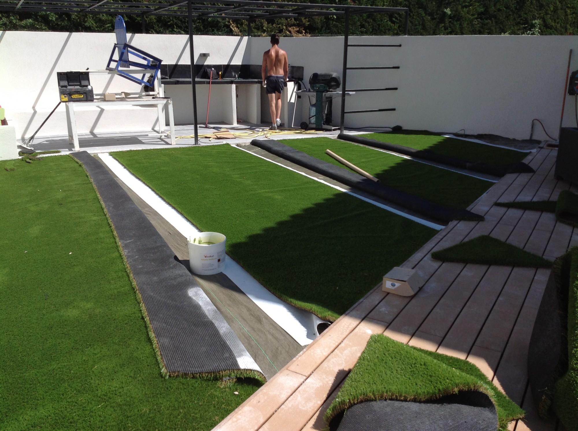 Les jonctions sont ensuite collées à l’aide de notre bande de pontage et de notre colle verte bi composante pour gazon artificiel.