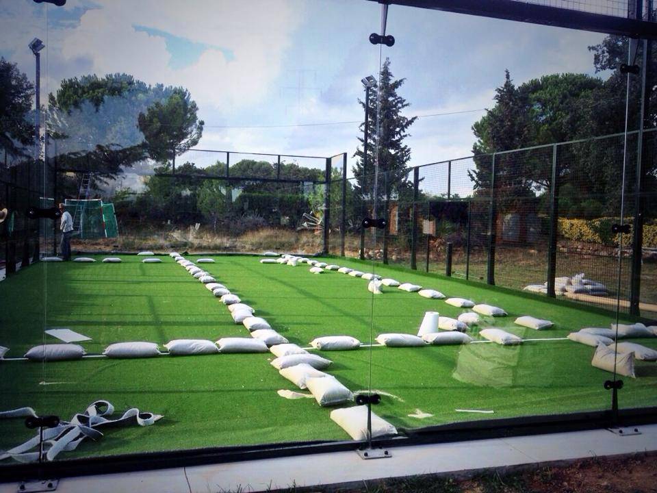 - Installation du revêtement synthétique : Nous installons le gazon synthétique spécial padel, puis le filet qui divise le terrain en deux parties égales en les fixant aux poteaux installés aux extrémités du terrain.