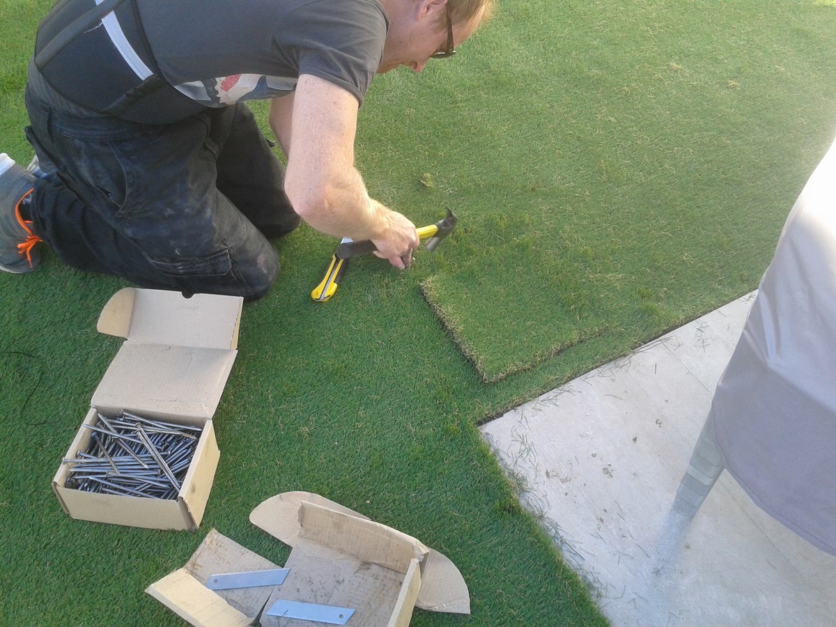Pour cette réalisation, nous avons tout d’abord décapé le végétal existant puis étalé et compacté une fine couche de sable calcaire pour obtenir une planéité parfaite. Ensuite, après avoir posé une toile de paillage anti-repousse, nous avons posé le gazon synthétique. Les lés sont positionnés bord à bord toujours dans le même sens. Les jonctions sont collées à l’aide d’une bande de pontage et de notre colle verte bi composante. Toute la surface est ensuite fixée à l’aide de clous de charpentier.