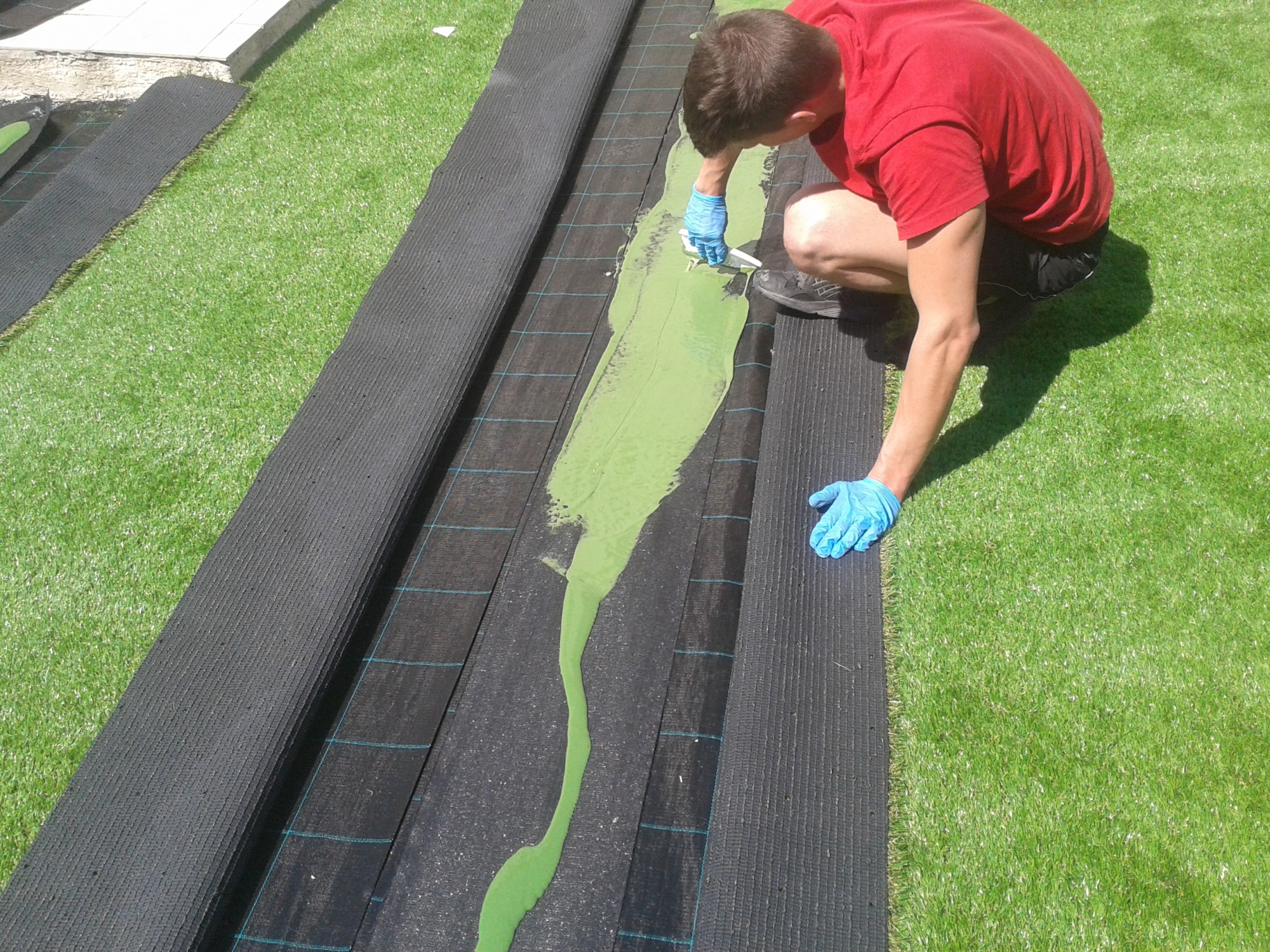 Les lés sont ensuite positionnés bord et à bords puis collés à l’aide de notre bande de pontage et de notre colle verte bi composante.