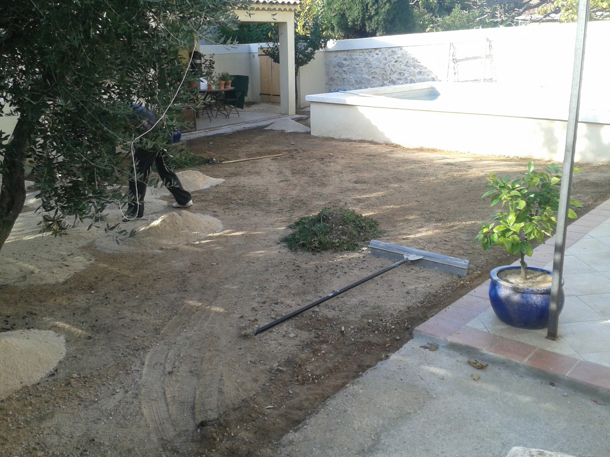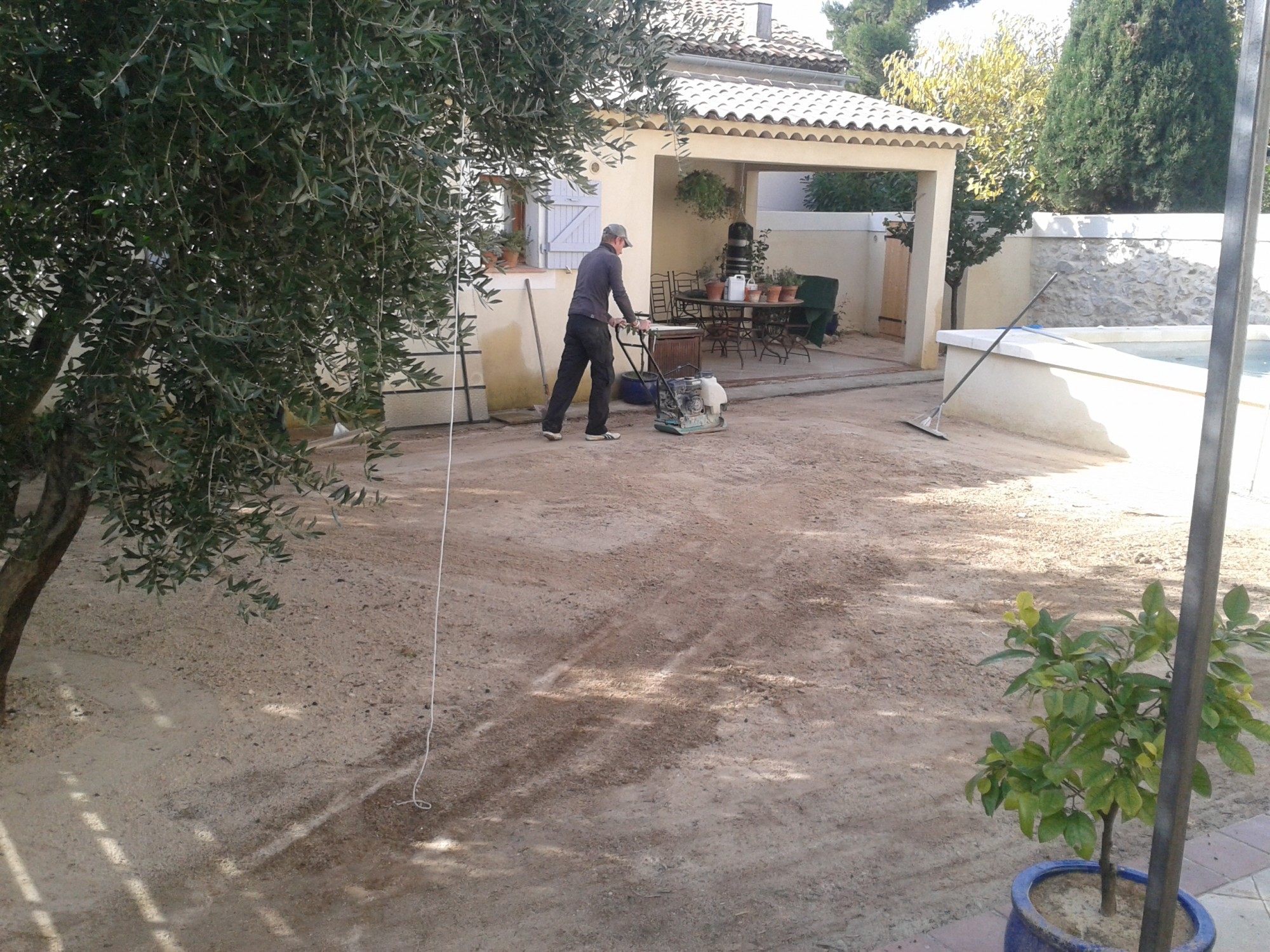 Nous avons tout d’abord préparé le terrain en enlevant toute la partie végétale et en étalant une fine couche de sable stabilisé 0.2 sur 2 à 5 cm.