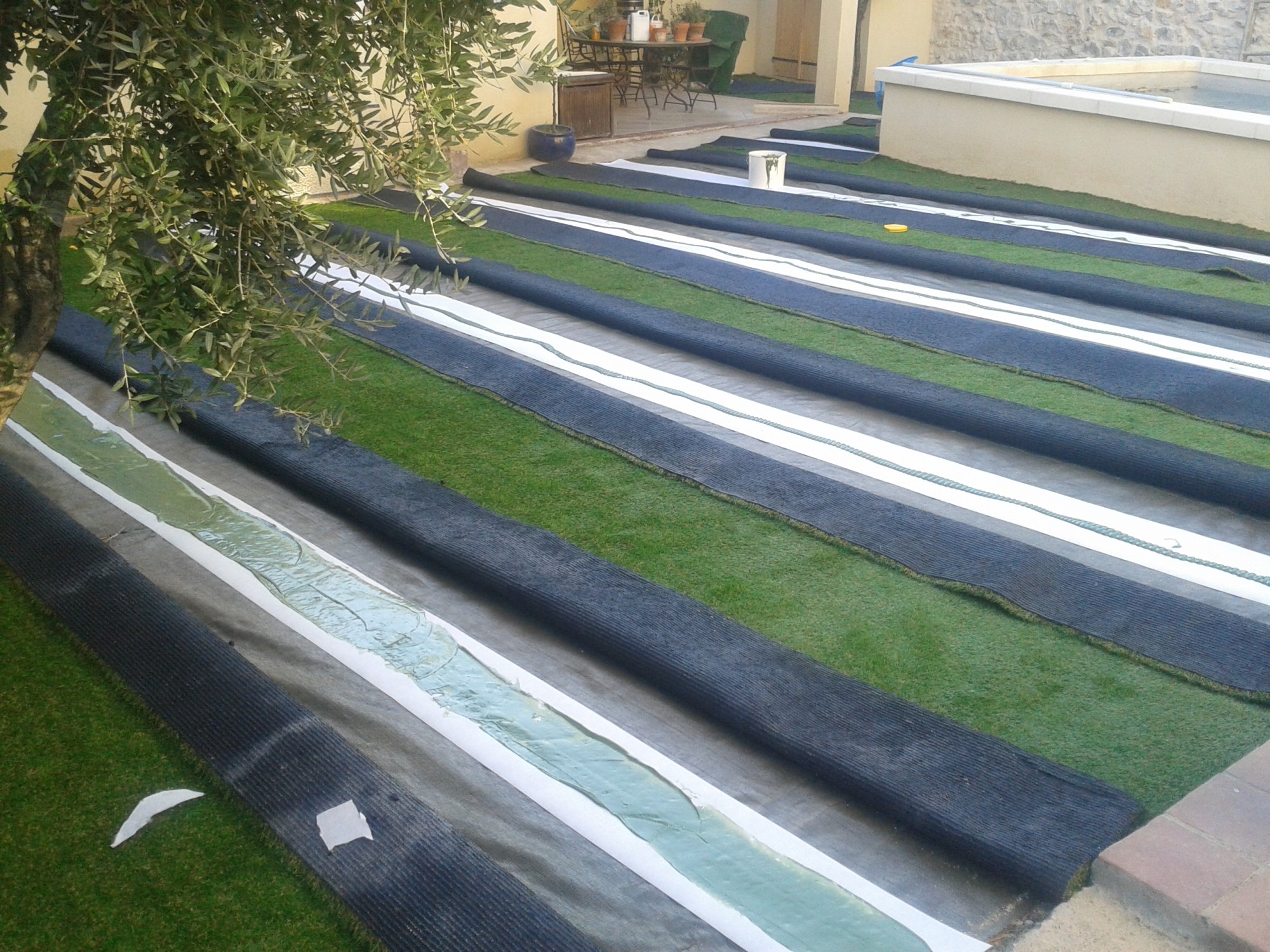 La pelouse artificielle est ensuite collée au niveau des jonctions à l’aide de notre colle verte bi composante et notre bande de pontage.