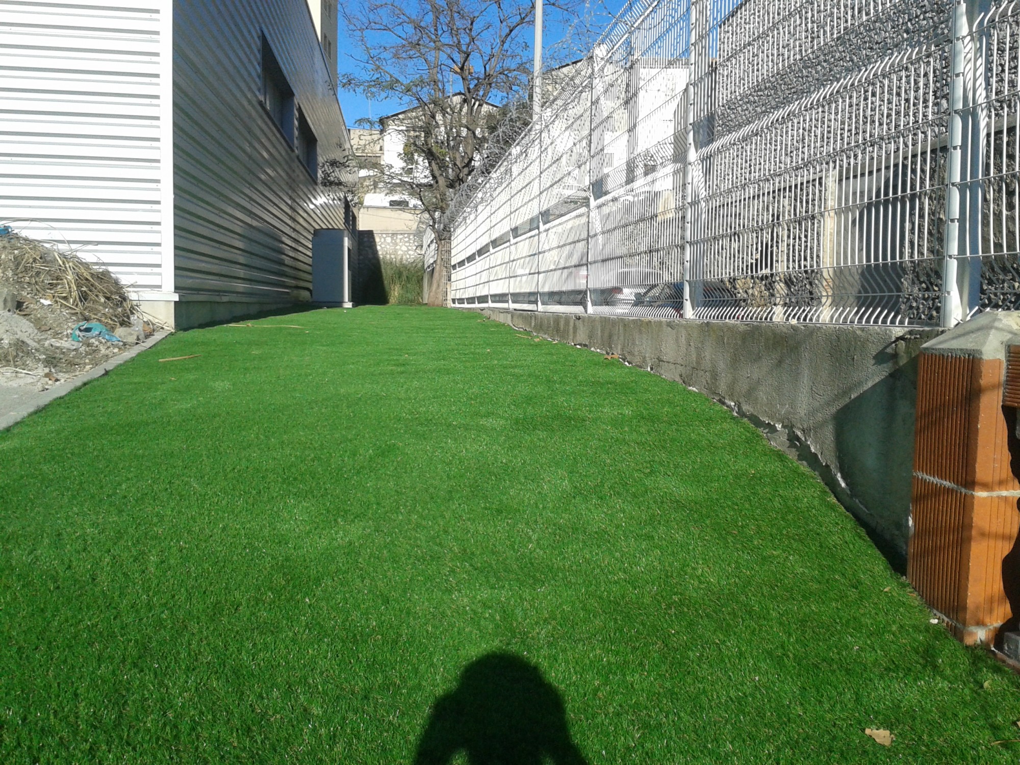 Univers Gazons a installé 200 m² de pelouse synthétique pas cher à Marseille à l’arrière d’un entrepôt.
