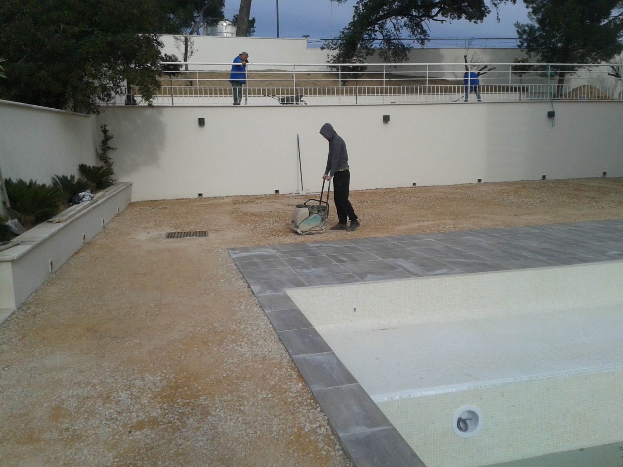 Tout d’abord nous avons réalisé le terrassement. Nous avons tout d’abord effectué un décaissement de 10cm puis étalé une couche de tout venant 0.2. Nous avons compacté le tout au rouleau compacteur.