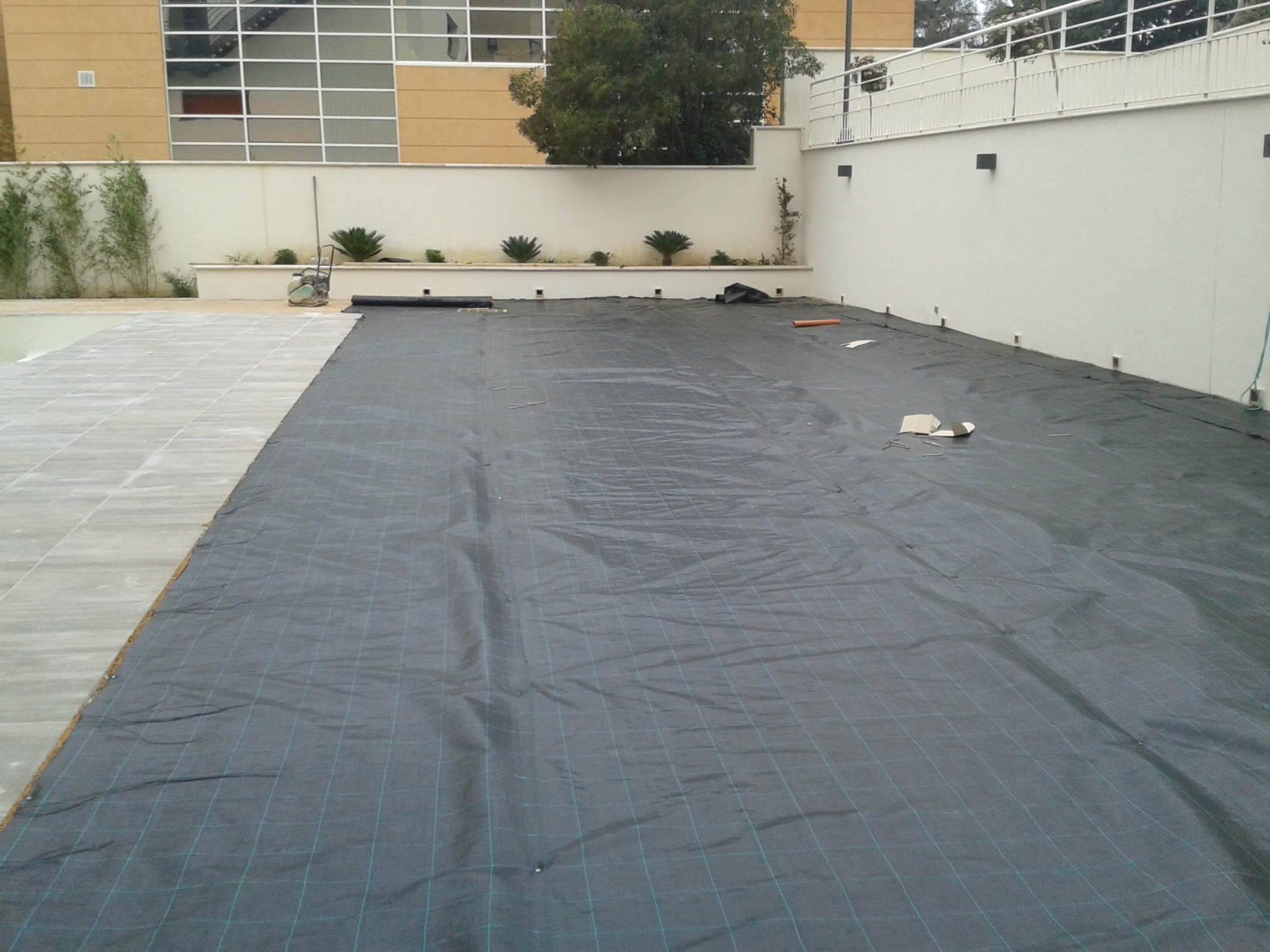La deuxième étape est la mise en place de la toile de paillage. Elle se présente en rouleau de 2m et est fixée à l’aide de clous de charpentier.