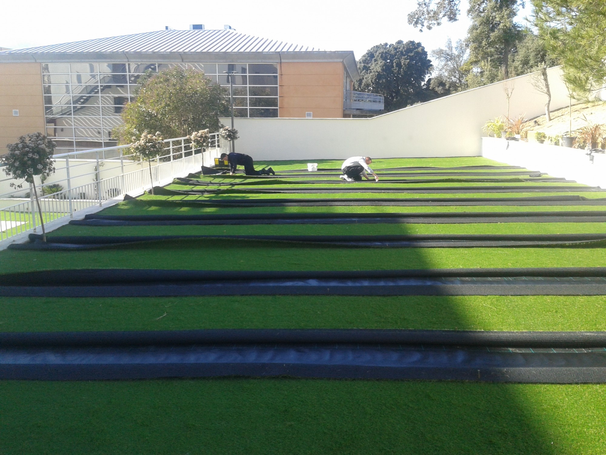Enfin nous avons placé les lés de gazon synthétique toujours dans le même sens. Ils sont ensuite collés à l’aide de notre bande de pontage et de notre colle verte bi composante.