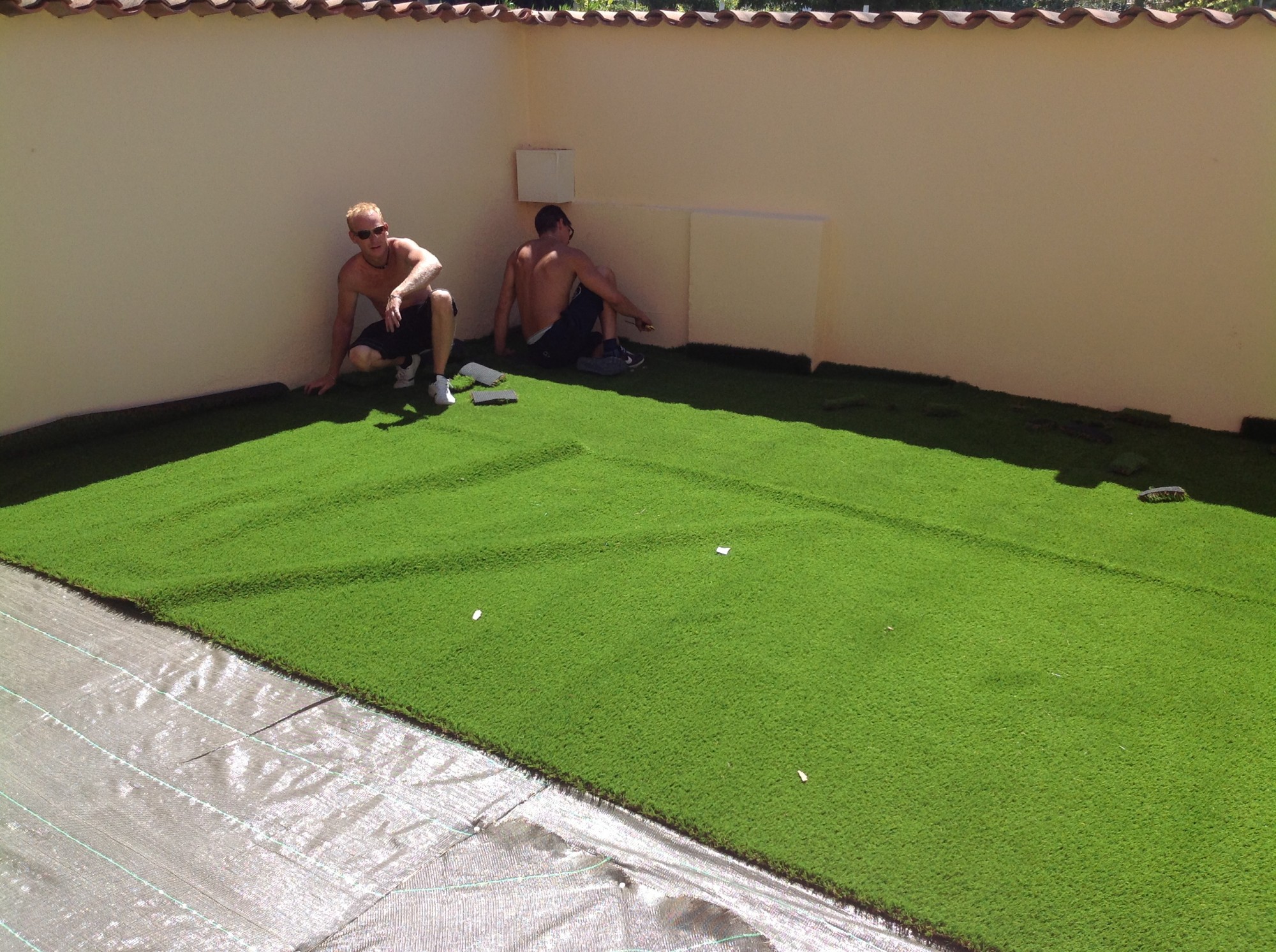 Nous avons placé nos lés de pelouse synthétique toujours dans le même sens, bord à bord puis réalisé toutes les découpes extérieures. Les jonctions sont ensuite collées à l’aide de notre bande de pontage et de notre colle verte bi composante pour gazon artificiel.