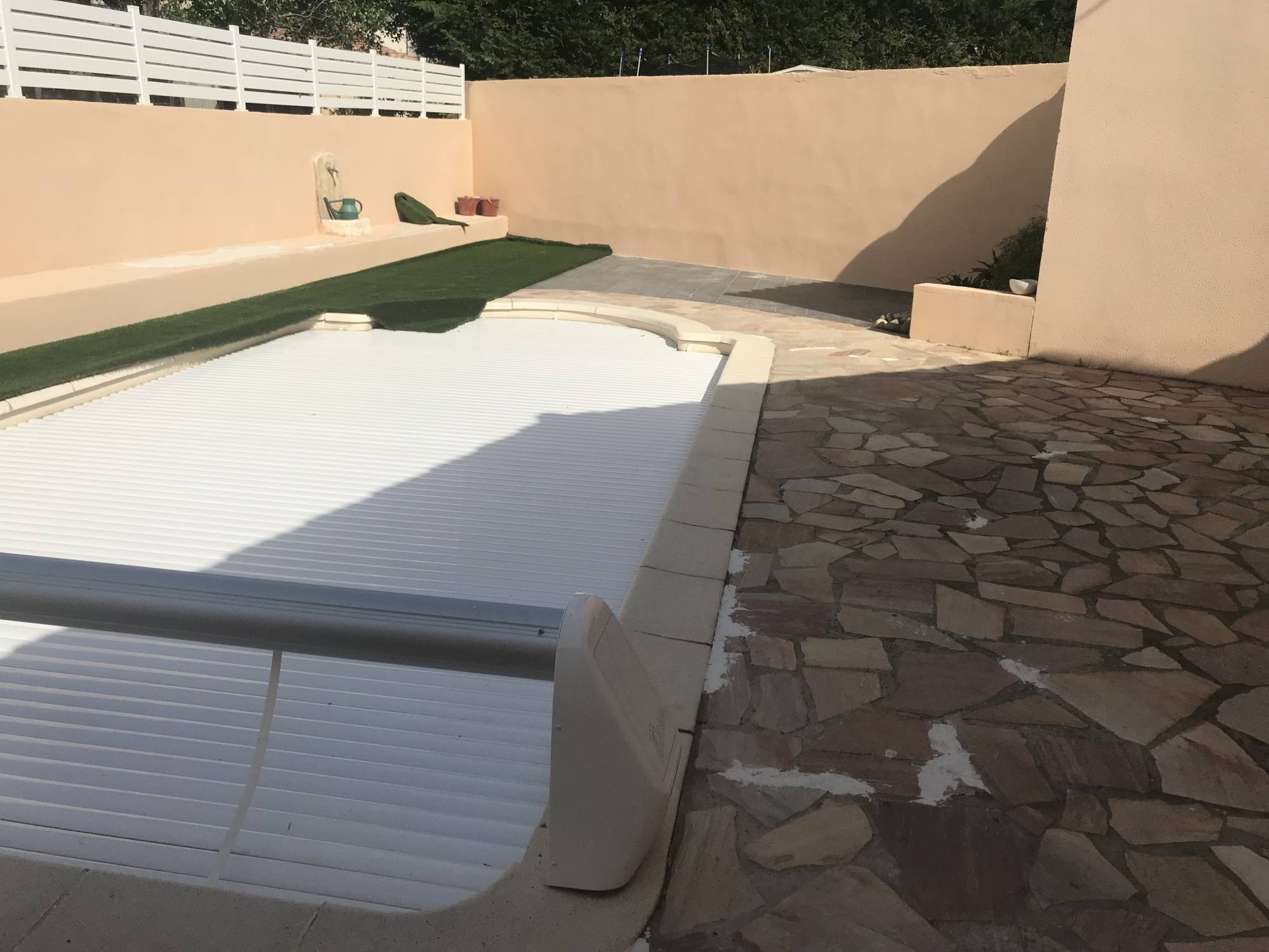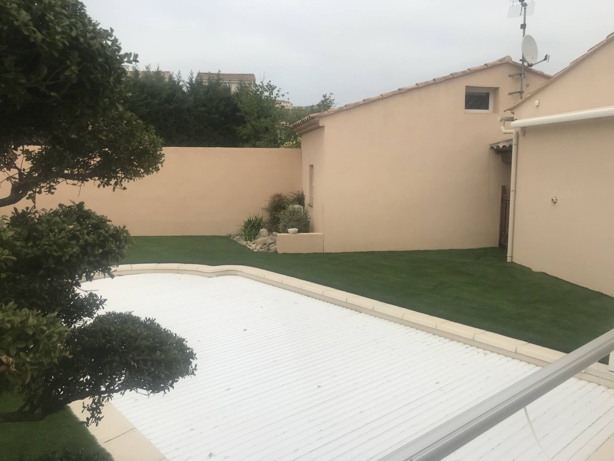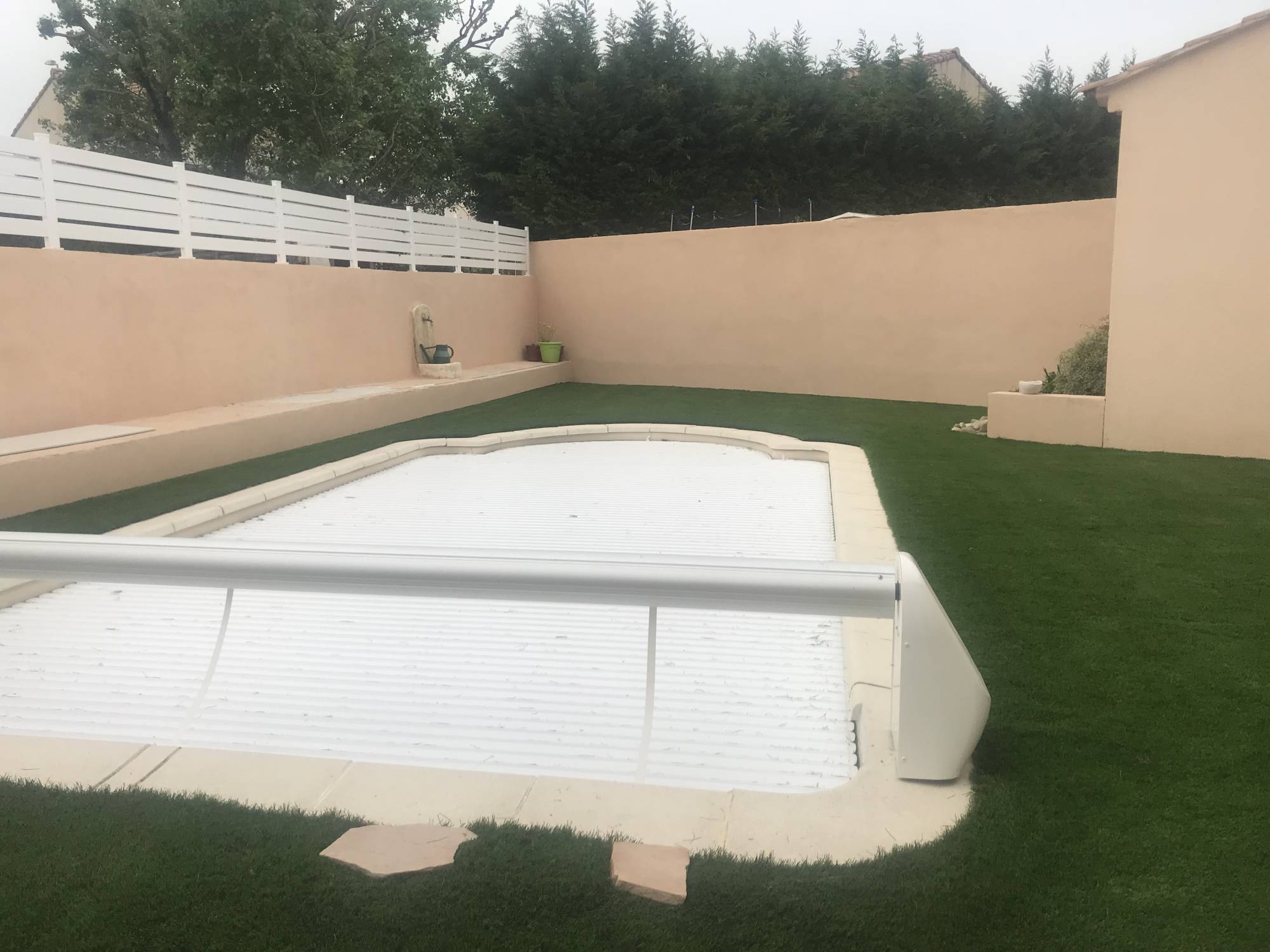 La solution était donc de recouvrir intégralement le tour de piscine constitué de carrelage par un gazon synthétique haut de gamme afin de conférer au lieu un espace de verdure.