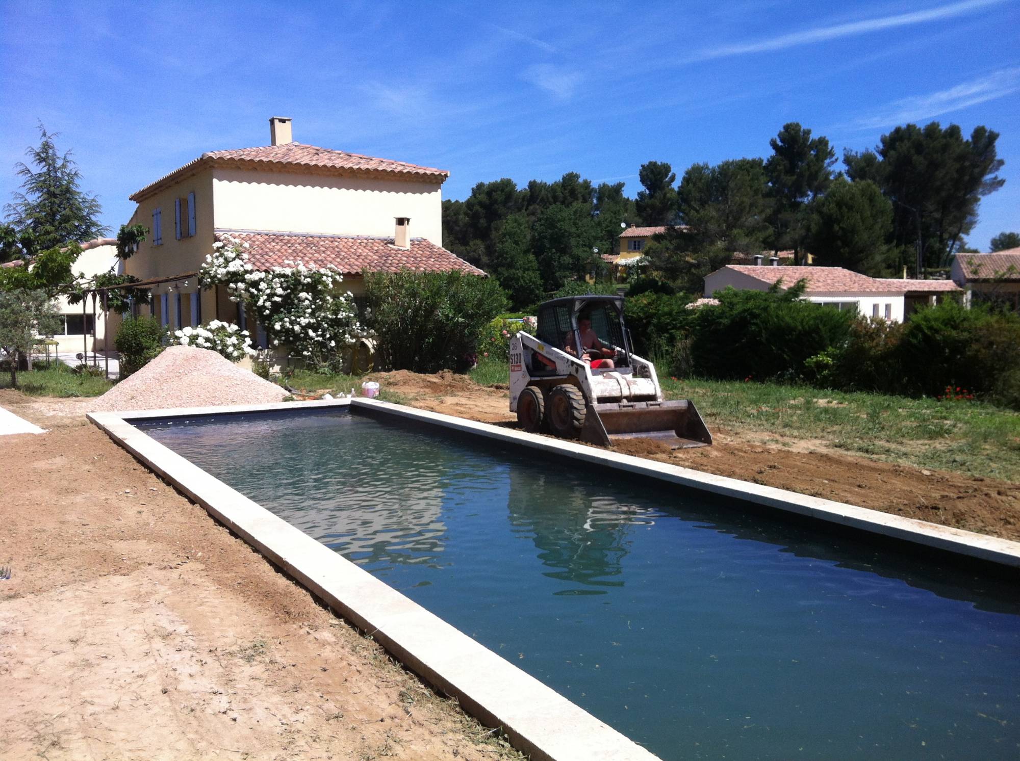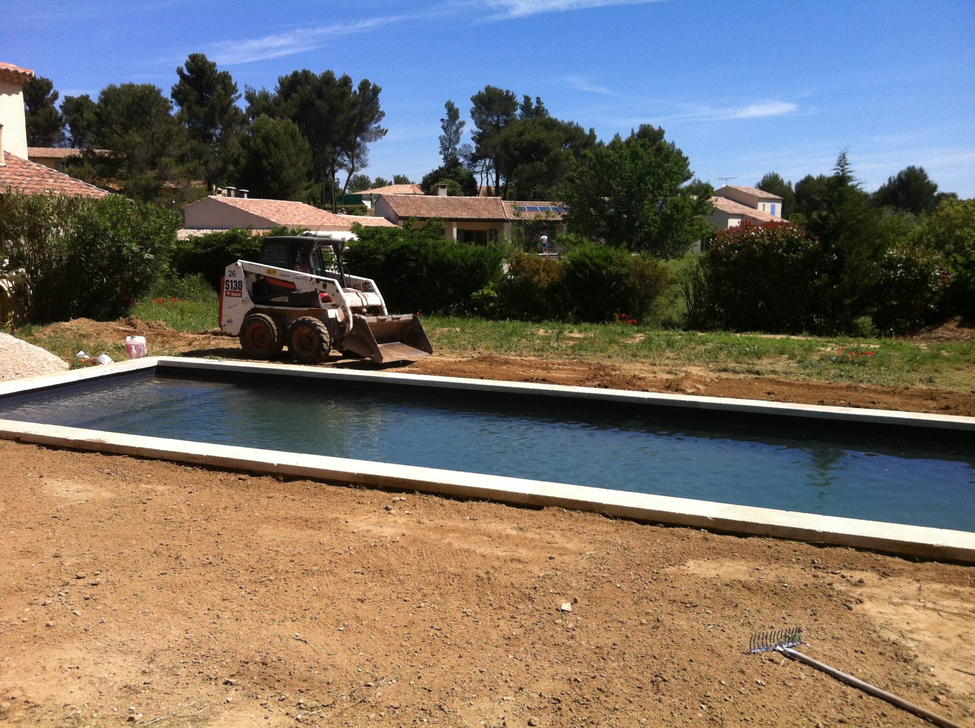 Ici, dans cette maison de Velaux,le terrain est assez accidenté et comporte de nombreuses aspérités. On doit dans un premier temps, effectuer un apport en tout venant afin de combler tous les trous et les différences de niveau trop importantes.