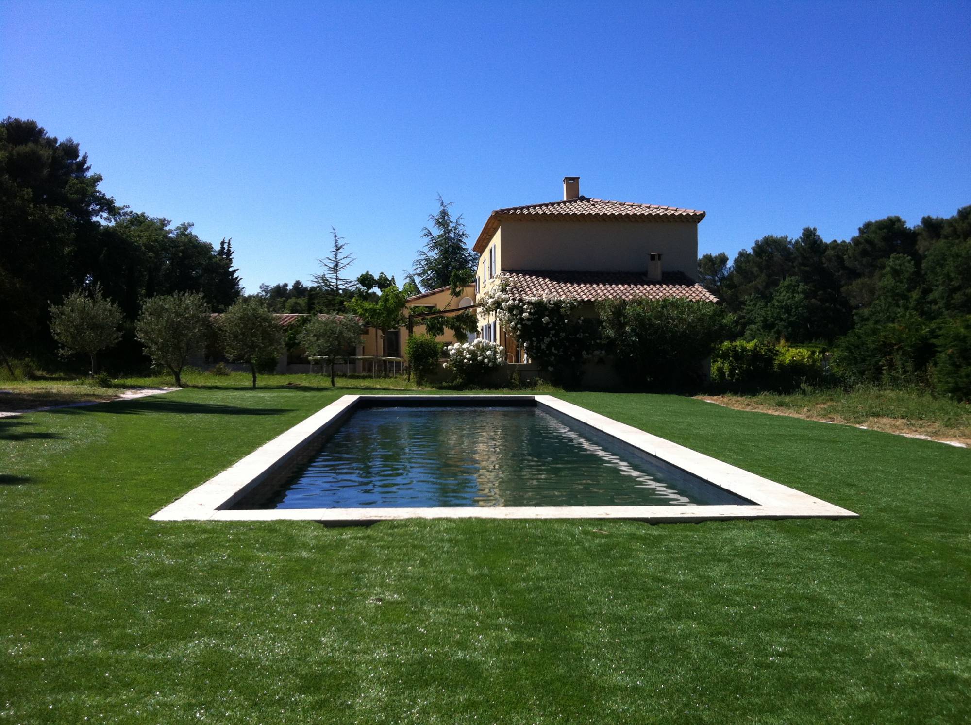 Universgazons a effectué la création d’un jardin avec entourage de piscine en gazon synthétique à Velaux près d’Aix en Provence dans le département des bouches du Rhône (13).