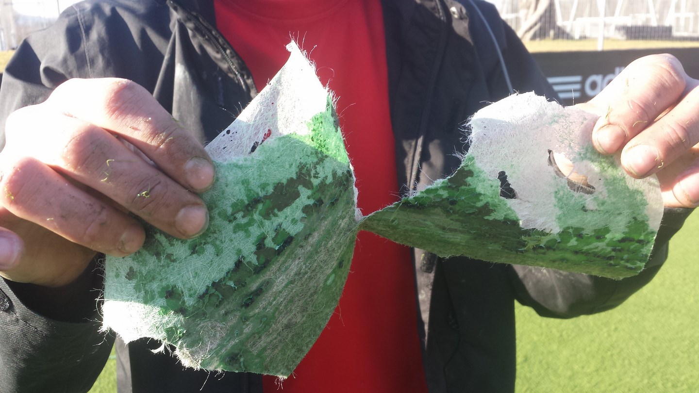Le gazon installé n’était pas adapté et l’encollage des lés entre eux était mal réalisé.
