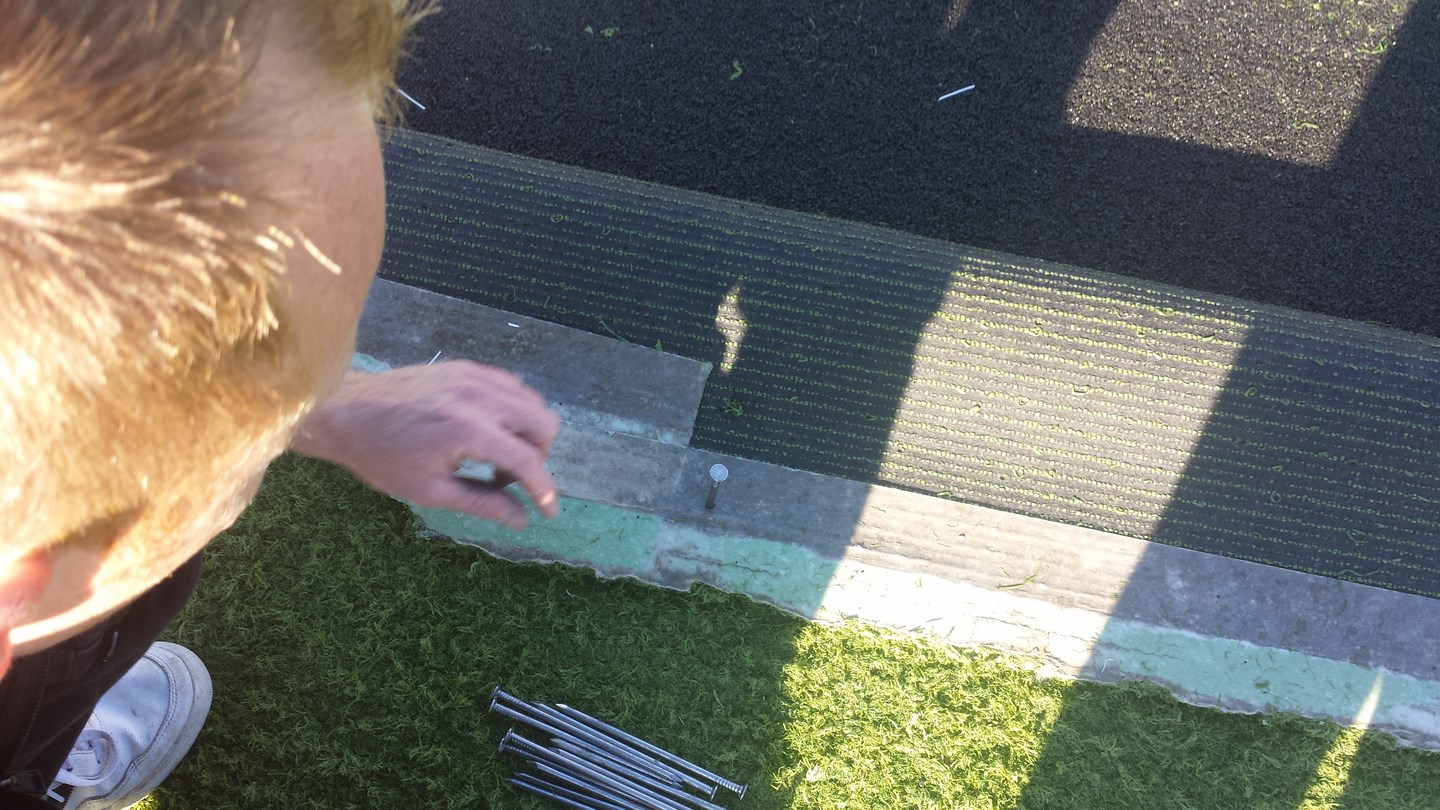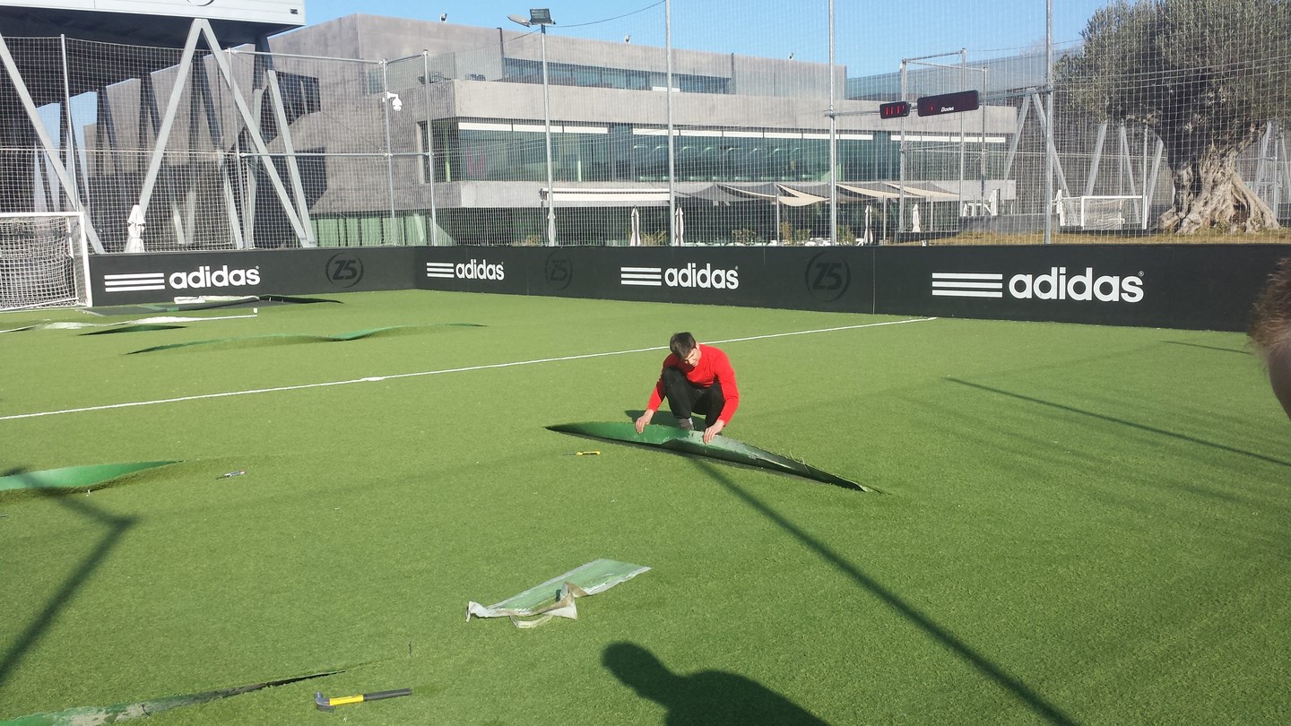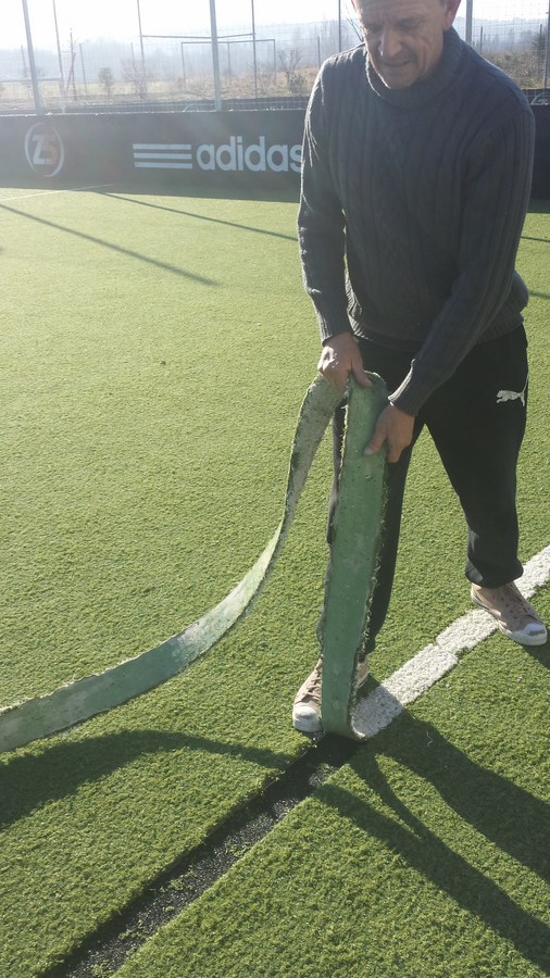 - Une fois le gazon enlevé, nous avons nettoyé la surface et procédé à des petits ragréages de la sous-couche en caoutchouc
